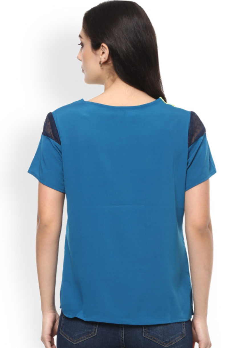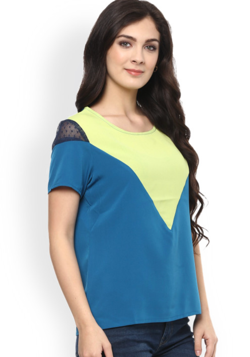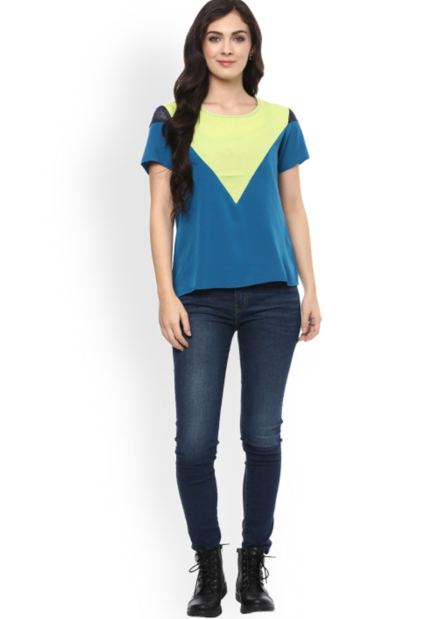 Women Blue & Yellow Colourblocked Regular Top