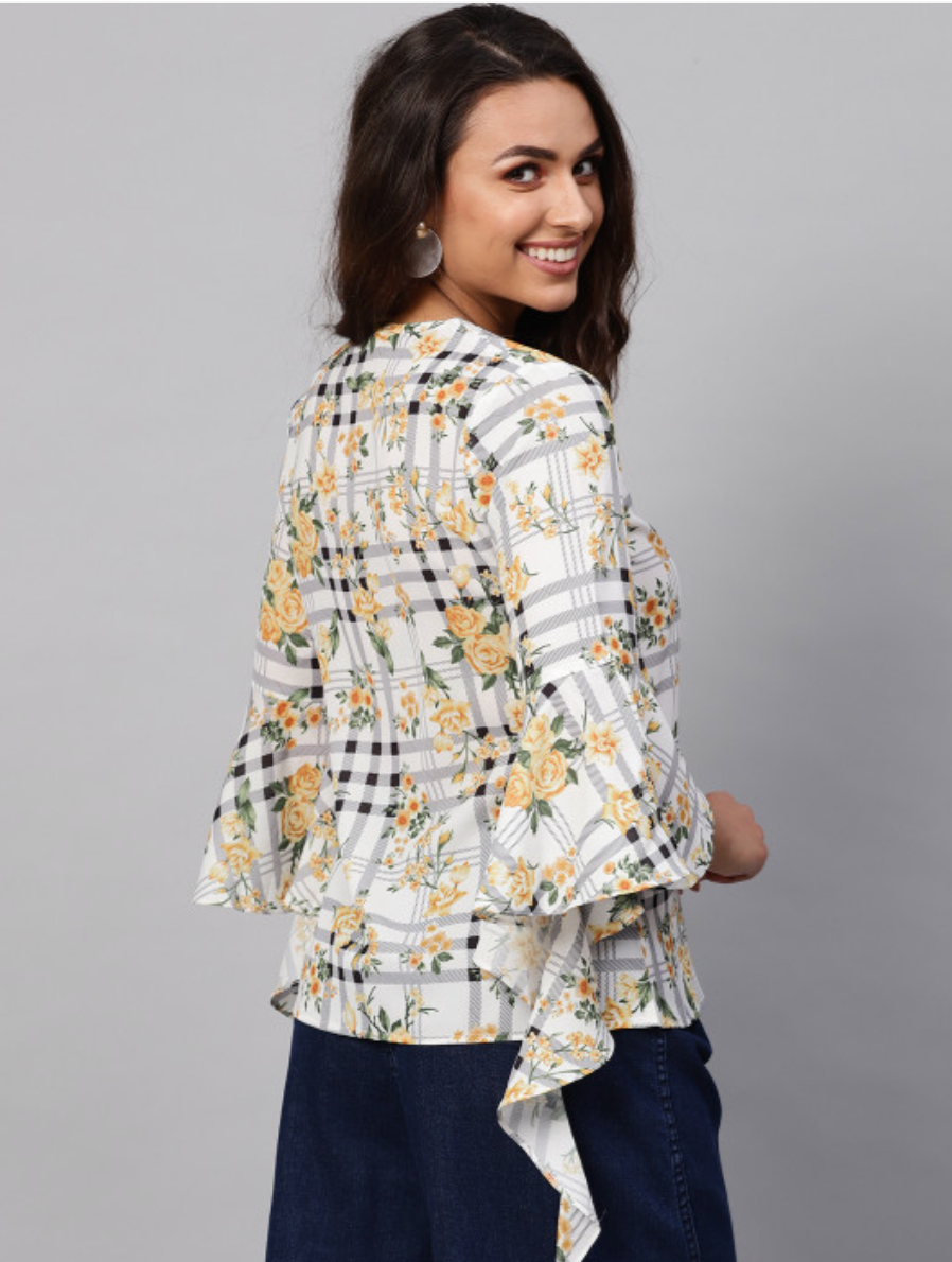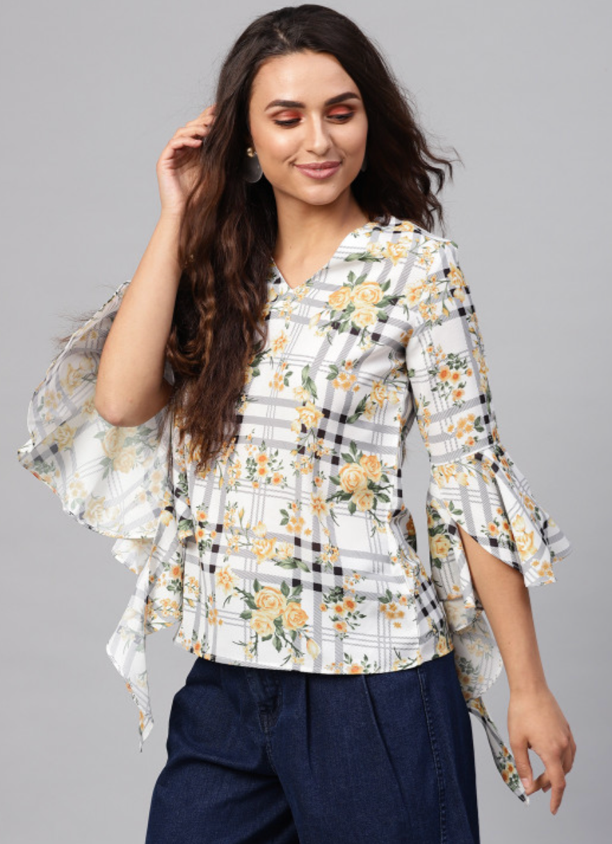 White and yellow checked woven regular top, has a V-neck, three-quarter sleeves