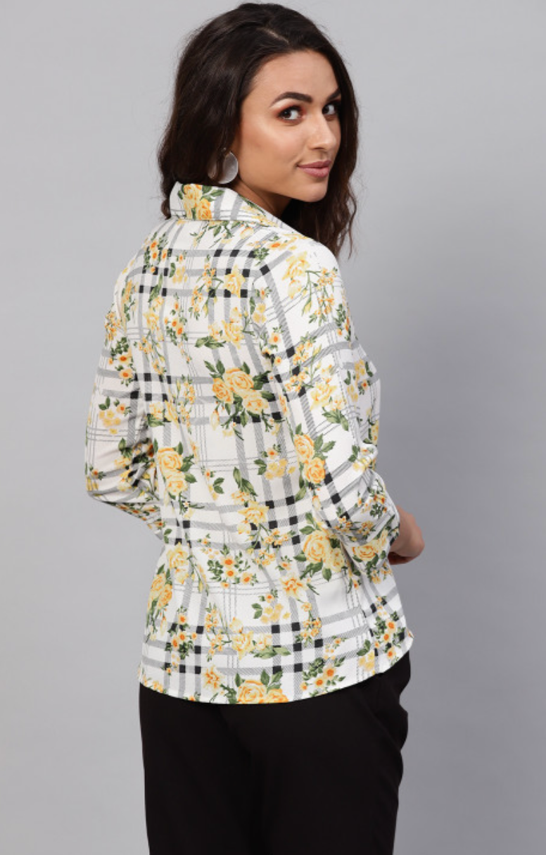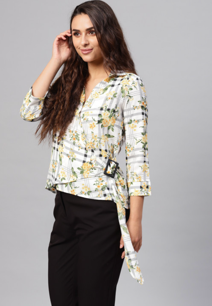 White and yellow checked woven wrap top with floral print, has a shirt collar, three-quarter sleeves