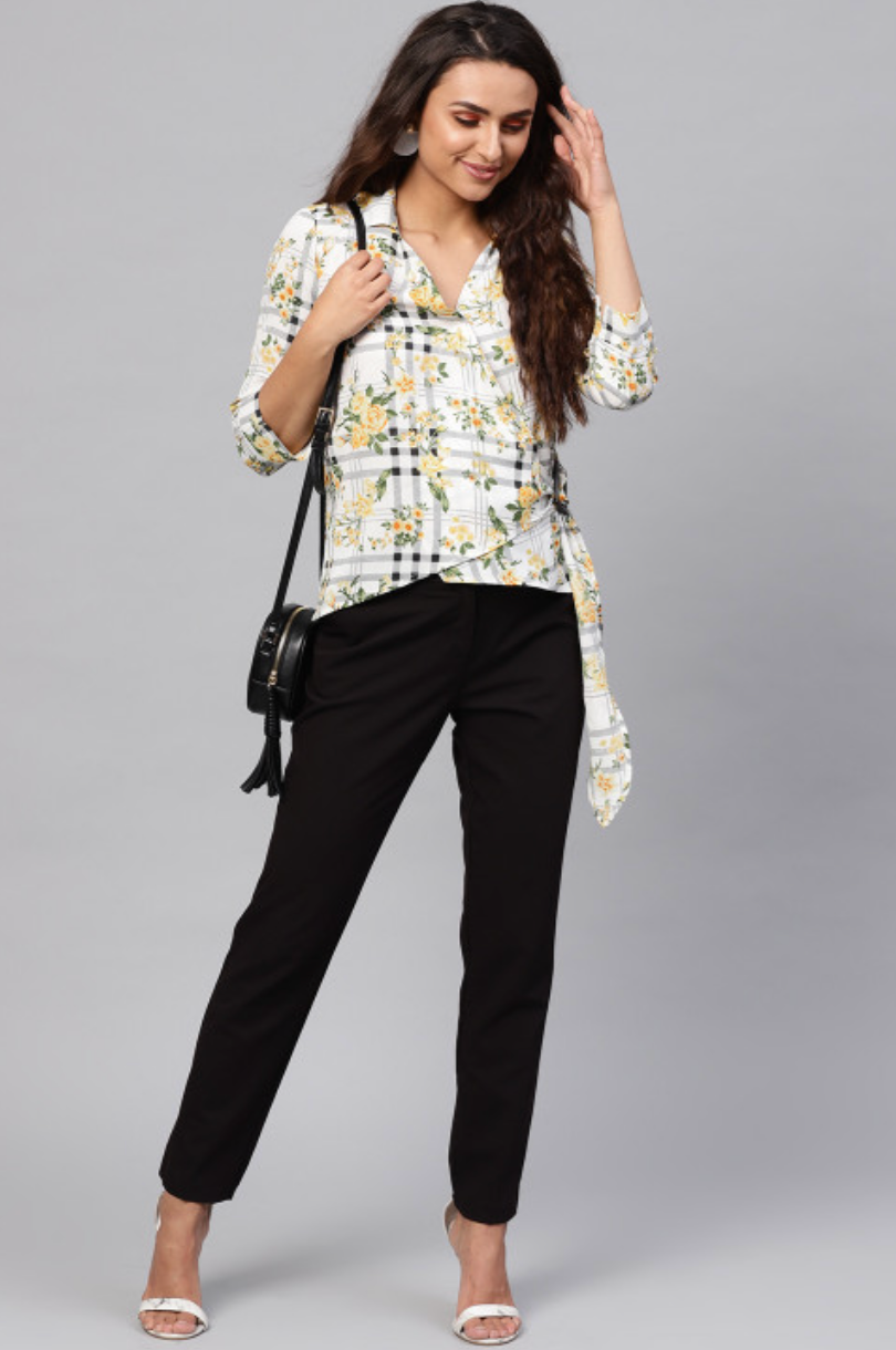 Women White & Yellow Checked Wrap Top